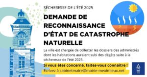 DEMANDE DE RECONNAISSANCE DE L'ÉTAT DE CATASTROPHE NATURELLEpour la sécheresse 2025La commune de Meximieux a subi un épisode de sécheresse durant l’été 2025. Cet épisode est susceptible d’avoir engendré des désordres sur certains bâtiments, dans les secteurs...